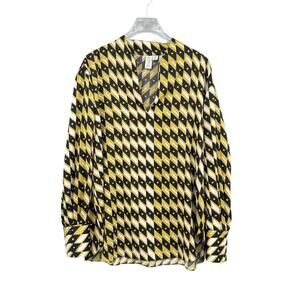 Joie Black & Yellow Geometric Diamond Print Long Sleeve Split V-neck Blouse