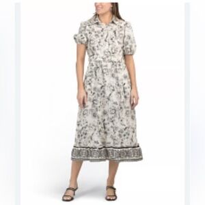 Elegant floral midi dress. Features short sleeves and a belted waist. Perfect for any occasion.