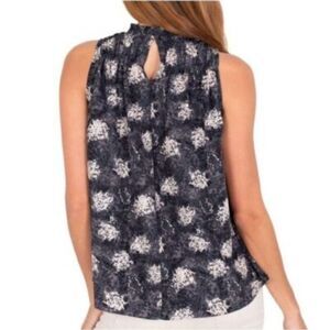 Joie Baltic Print sleeveless a-line floral print top in grey, blue, black & white. Smocking detail at front yoke.