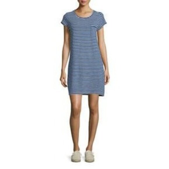 This dress from Joie is in excellent condition. It features; an allover striped print in blue & white colors, rounded neckline, short sleeves, chest pocket, shift silhouette, straight hemline with pullover styling. Made from 100% cotton.