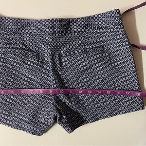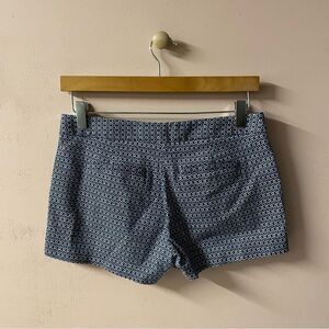 Cute blue low rise shorts with a white geometric print all over. Has a hook-eye zipper closure. In excellent condition! Approximate measurements shown in photos. Feel free to ask questions or make an offer!