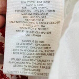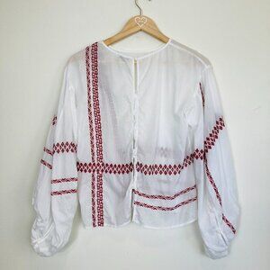 Very light and airy, white cotton boho top with red embroidery. Bishop sleeves with button detail at cuff and button up back. Semi-sheer and perfect for summer.