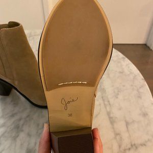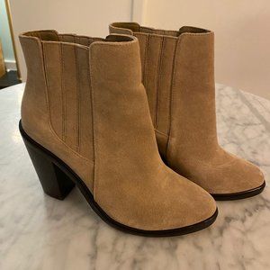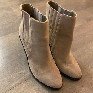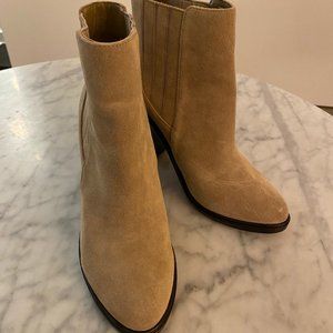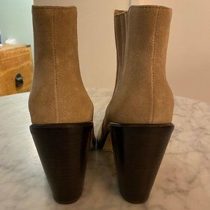 Crafted in neutral luxe suede, these western inspired ankle boots feature a pointed toe, 4 inch wooden heel for all day comfort and covered elastic side panels to ensure they go on and off with ease. Wear yours this season with mini skirts and cropped jeans for a Parisian inspired look.
