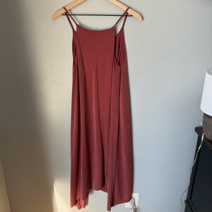 This is a burgundy Joie dress or coverup with spaghetti straps and a built in bra. It is maxi length with an asymmetrical hem. It is missing the materials tag but is otherwise pre-owned in excellent condition.