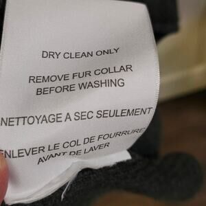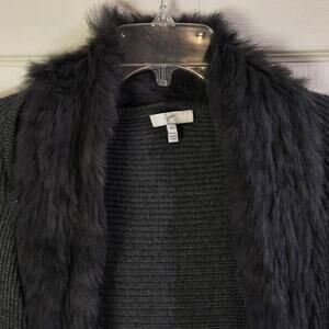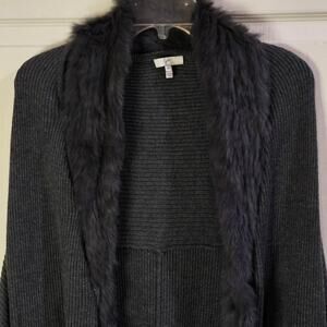 Length 36; Chest (pit-to-pit) 25; Sleeve Length (from neck) 30. Joie dark gray open-front cardigan with faux fur collar, size medium. Ribbed knit texture, long sleeves, and elegant drape. RN#105230. A refined layering piece that works well with denim, trousers, or dresses. Pre-owned, no major flaws noted.