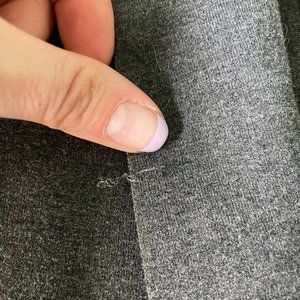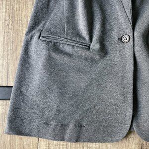 This is the most comfortable blazer of all time. It's like a stretchy, thick, t-shirt material - awesome lightweight feel for spring and summer. Comes in Size Small with medium gray color and a single button. Sleeves are midi and permanently rolled (sewn that way). Rounded hem at base of the blazer and long for those with a long torsos. There is one slight pull on the right sleeve (pictured) and it is in very good condition.