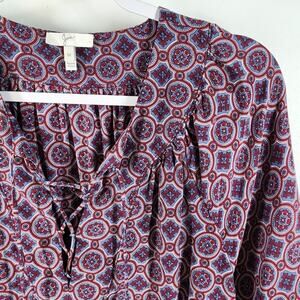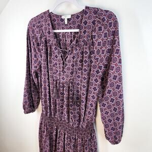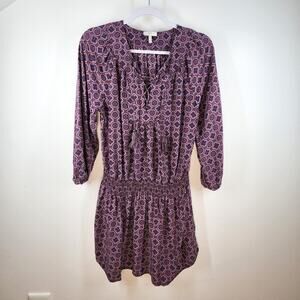 - Description: Burgundy and blue novelty printed mini dress with smocked drop waist; 3/4 sleeve length; lace up v-neck neckline
