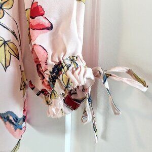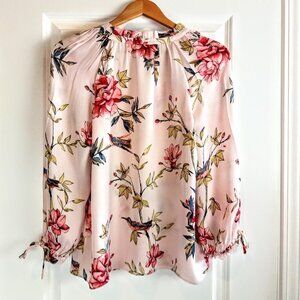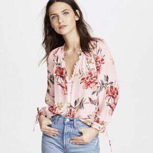 Pure silk georgette Corsen blouse from Joie in a colorful "Rosewater" pink, red, blue and green print.