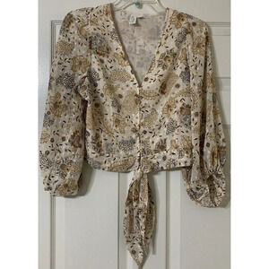 Joie Cream Sheer Lined Floral Tie Front Peasant Blouse Top Size M (B12)