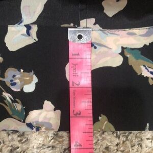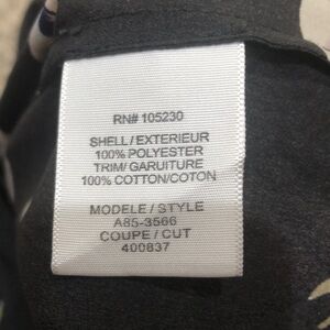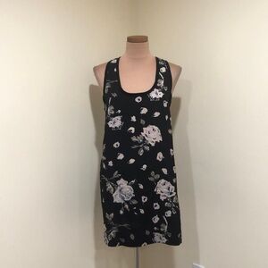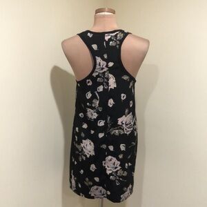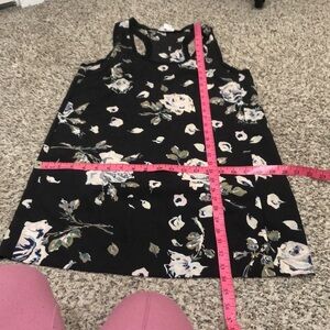 Excellent condition no stains rips or fading. It was professionally altered to be a few inches shorter. Sleeveless, scoop neck, racer back, tank dress that falls just above the knee. Relaxed fit pullover style. Not stretchy. 100% polyester. Black with flowers.