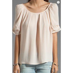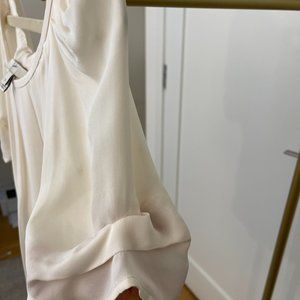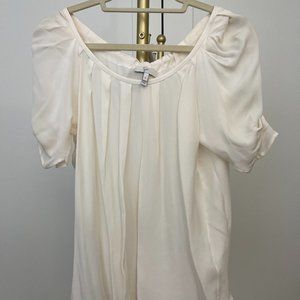 100% silk. Dry clean only. Pleated neckline with back drawstring tie closure. Pleated sleeve detail. Worn only a few times, cream/white color. Beautiful and lightweight - perfect for summer!