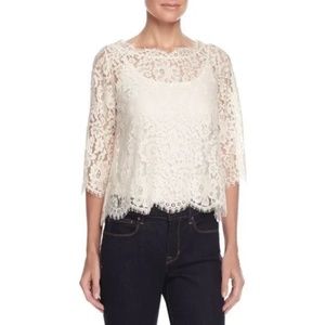 Joie Elvia Lace Top. Has a button button back closure. 3/4 length sleeves. Ivory White color lace. Scalloped hem. Sheer see through but is great to throw over a cami or dress. Wedding Bride style. Does not come with tank underneath. Excellent condition. Size extra small XS.
