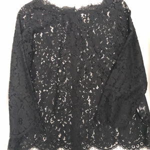 Elvia Lace is 3/4 sleeve, crew-neck lace top with a button closure down the back. Scalloped edges make this shirt easy to pair with jeans or a dressy skirt. Excellent condition, no flaws. (Camisole not included)