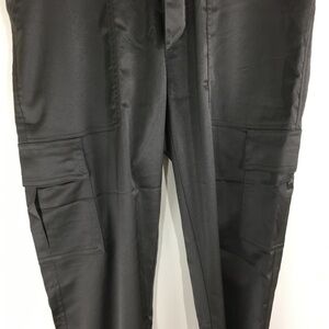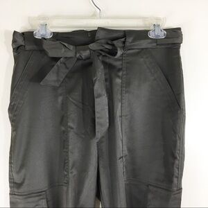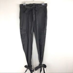 Joie Erlette sateen cargo pants with self-tie details at cuffs. Mid-rise. Self-tie belt. Zip fly with hook and bar closure. Side slant pockets. Leg and back flap pockets.  15" at the knee narrows to 13" at the leg opening. New with tags. Polyester, machine wash.