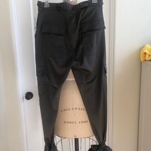 Beautiful updated cargo style pants. Shiny satin like material (polyester) with cargo pockets and ties at the wast and legs. Color "fatigue" size 2. New with tags.