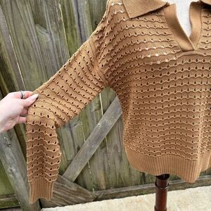 Joie Eyelet Cutout Collared Neckline Bronze Brown V Neckline Sweater