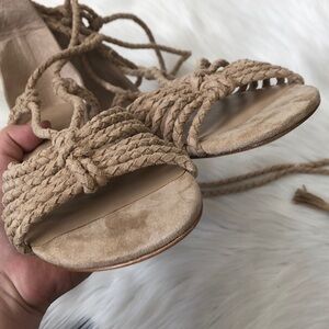 Suede upper and lining. Slim braiding straps which wrap around the ankle. True to size. Lightly padded insole.