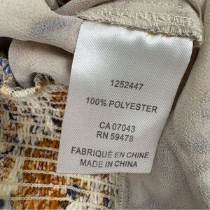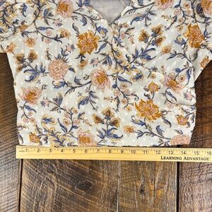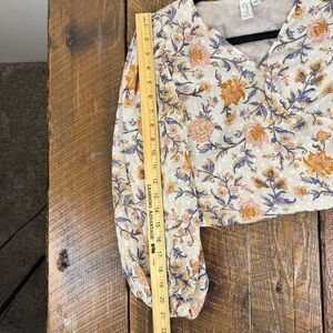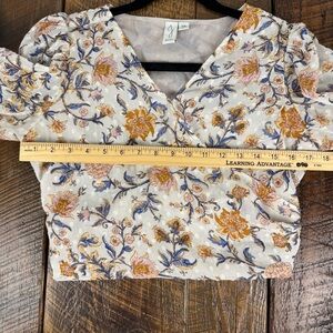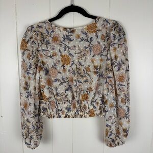 Joie Faux-Wrap Cropped Floral Top Smocked Sheer Sleeves Cream Orange Boho Print