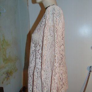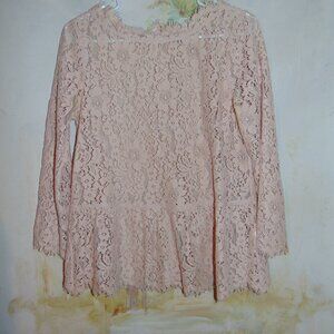 Elevate your style with this beautiful Pale Pink JOIE Floral Lace Blouse Top. The blouse features a boat neckline and 3/4 sleeves with a casual sleeve type. The textured lace and back buttons adds a touch of elegance to the blouse, making it perfect for any occasion, including travel, weddings, parties, casual outings, workwear, and business meetings. The blouse is made of a rayon cotton blend material with a lace fabric type, making it comfortable and stylish. The scalloped, textured lace, fringe, and button back accents make this blouse a must-have for any fashion-forward woman. The blouse is available in a size small, and the color is pink. This blouse fits regular size women and has a romantic, boho, classic, and coastal theme.