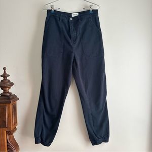 In like new condition! Smocked elastic ankles. Large front and back patch pockets. Inseam approximately 28”. Fit shown on model.