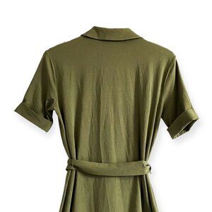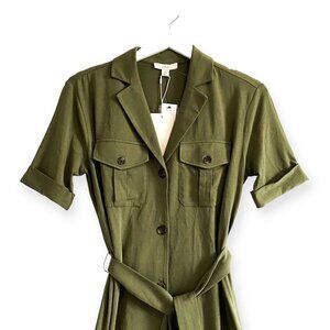 Joie Jadallah Shirt Dress in moss green. Collared neckline with notched lapels, button front closure, belted waist tie, chest button patch pockets, rolled cuffs. Modal/cotton/spandex blend. Machine washable. New with tags.