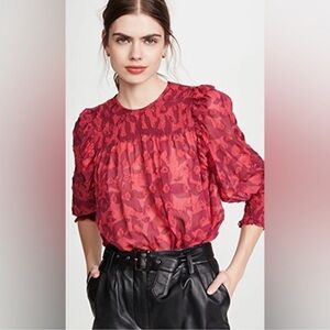 Joie silk blend blouse with a soft red-pink floral print layered with textured detailing.