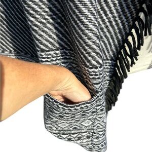 Joie Jocope Multi-Printed Jacquard Cardigan. Size medium. Approximate measurements laying flat are 22” pit to pit and 24” length. In good preowned condition with no noted flaws. Spread collar with tassel trim; open front. Long, wide sleeves.Front open-patch pockets. Draped hem. 50% wool and 50% yak.