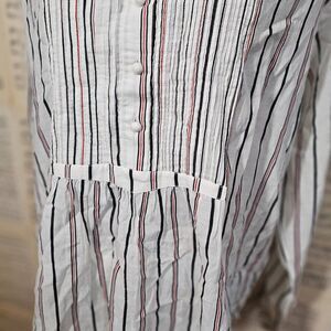 Joie L Long sleeve half button up super lightweight and versatile for spring and summer days. White with black and red stripes, marked size large, nearly 22" chest and longer tuck or untucked bottom hem, measures about 27" long
