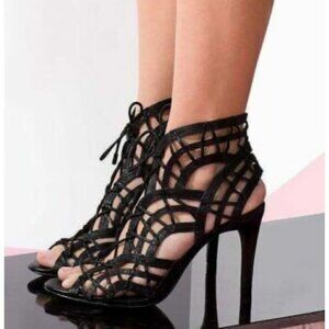 Features: lacy style leather upper with lace up closure, peep toes, cut out back heel, 4" skinny heels