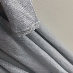 Size medium linen and silk blend light gray high low cardigan. Very soft and lightweight. Perfect for layering. The cardigan has pen marks on the sleeves as shown. As well as a small stain. All shown in the last few photos.