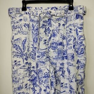 Joie Linen Wide Leg Belted Pants White Blue Tropical Beachy Coastal Size XL