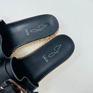 Joie Lyla sandals in women’s size 7.5. Black leather slides with oversized tortoiseshell-style buckle detail. White platform sole with tan woven trim for a modern, chic look. Comfortable and stylish—perfect for summer wear.