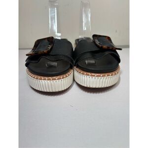 NWOB Joie Lyla Slide Plateform Turtle Shell Buckle Black Leather Strap Mule Size 8.5. The Joie Lyla Slide Platform Sandal in black leather is a stylish and versatile choice for various occasions. Featuring a slip-on style with a wedge heel, this sandal has a chic medallion accent on the strap and a turtle shell buckle detail for added flair. The platform design provides comfort and stability, making it suitable for parties, casual outings, or everyday wear.