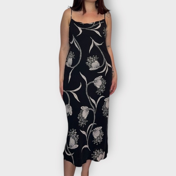 Elegant black maxi dress with white floral pattern & slight cowl neckline. The dress has adjustable straps as well!