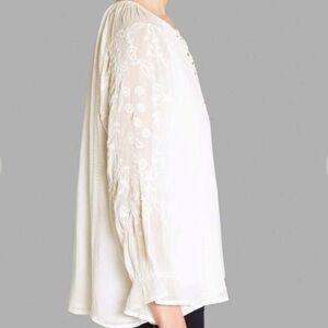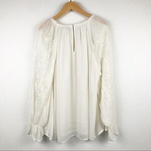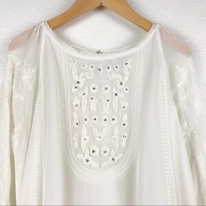 Elegantly embroidered, the Metta Blouse by Joie is a sheer silhouette styled with gathered elastic sleeve cuffs and beaded detailing.