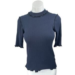 Joie Navy Blue Ribbed Knit Ruffle Short Sleeve Mock Neck Sweater Top Size M