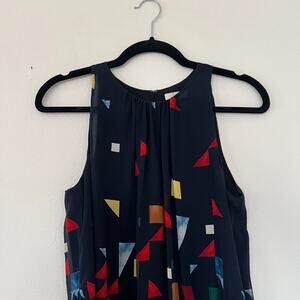 In good preowned condition other than a small run in the fabric near the bottom. Geometric print. Silk outer. Lined.