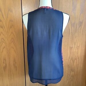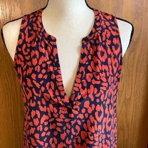 Cute Joie navy and orange cheetah print 100% silk sleeveless top with a V-neckline. Back is a navy semi-sheer silk. Approximate measurements laying flat: bust 19” across from armpit to armpit and length 24”. In excellent worn condition. No stains, holes or tears.