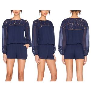 Joie Navy Jevin Silk Romper Pockets Long Sheer Sleeves Floral Lace Short Jumper