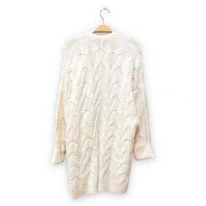 This sweater coat, in a classic long-line silhouette, is the perfect mid-weight layer for chilly days and chillier nights. (added bonus: the extra large pockets will keep your fingers warm.) Super cozy oversized fit, chunky cable knit design. Perfect for fall and winter. The color is a cream color called porcelain.