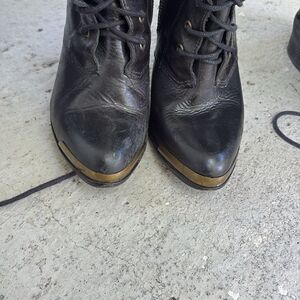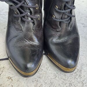 These are fantastic boots but please check out the pictures. They are not perfect but they are still very good. Measuring from the back of the hill to the top of the shaft is 20 inches laying flat. The width is 7 inches heel height is 4 inches. Lace up with zipper.