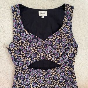 A chic and versatile Joie floral dress with a flattering v-neckline, fitted bodice, and A-line skirt. Perfect for spring, summer, resort wear, vacations, garden parties, weddings, and everyday chic. The caviar black background with multi-color floral print makes this dress timeless and flattering. Dress it up with heels or keep it casual with sandals or sneakers.