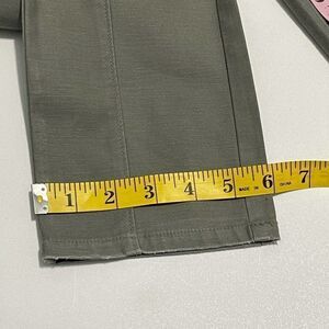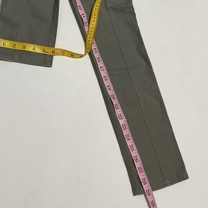 Features: Skinny pants, green color, zippered pockets, button and zipper closure, zippered back pockets, zippered leg pockets, slip in pockets, ankle length