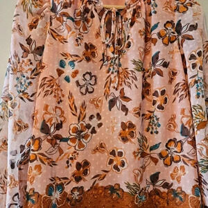 Joie Peach Floral Bohemian Peasant Chiffon Swiss Dot Ruffle Top Tie Blouse XS.