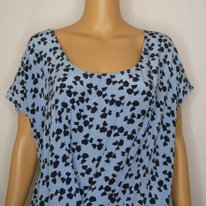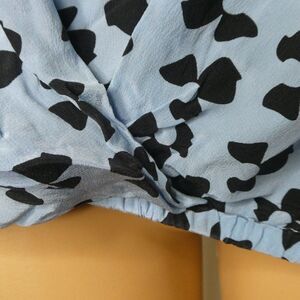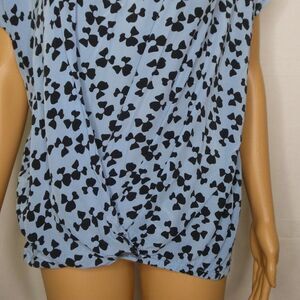 Beautiful blue blouse with short sleeves and crossover/faux wrap front. Scoop neck. Feels like silk, but the material tag is missing so not positive. In excellent condition.