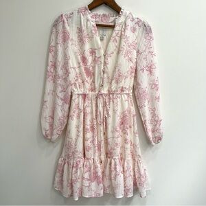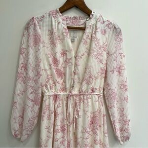 Joie Pink Floral A-Line Mini Dress Long Sleeve Small Soft Girl Coquette Girly. This is so pretty!! Semi sheer, long sleeves and pearl button detail. Elastic waist with belt.