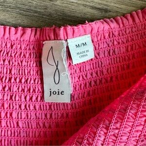 This Joie floral mini skirt is a breezy, feminine essential for warm-weather days. Designed with a wide smocked waistband and tiered ruffle hem, it offers both comfort and a flattering silhouette. The vibrant pink floral print makes it a perfect match for resort wear, brunch outings, or everyday sunshine style.
