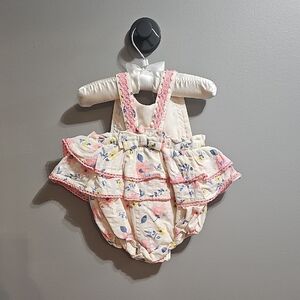 These charming sun suit with matching hat outfit Joie feature a delightful pink and white color scheme, perfect for adding a touch of elegance. The ruffled edge adds a playful and decorative element, making them a stylish choice for any occasion. Crafted with care, this outfit ensure comfort and style in one adorable package.