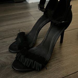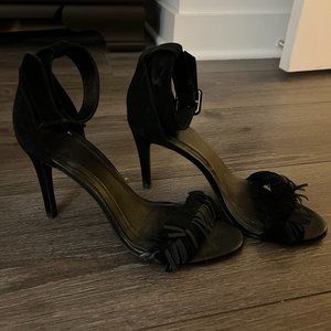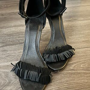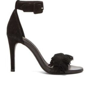 Joie Pippi Black Heels in amazing condition (featuring only minor wear on bottoms of shoes, as shown in photos). These sandal heels feature soft suede fringe accents on top of the toe straps, along with a suede buckle ankle cuff and a leather sole.