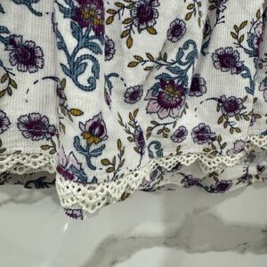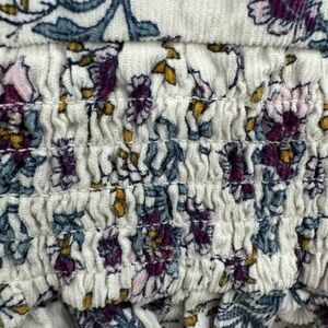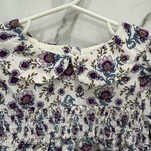 Charming baby top with purple and blue floral design. Features long sleeves and a smocked waist.